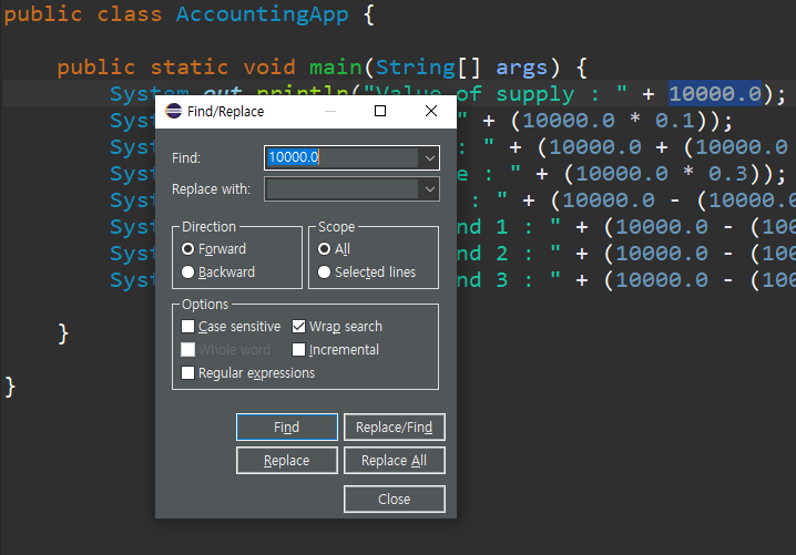 System.out.println("Value of supply : " + 10000.0);
