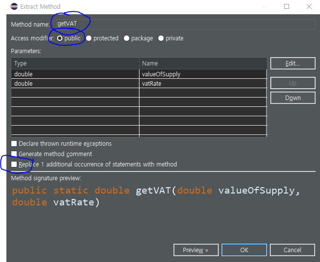 메서드 이름을 작성하고 퍼블릭, replace 체크 박스는 해제해 줍니다.