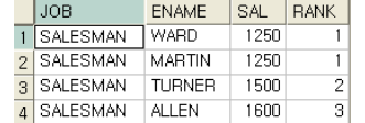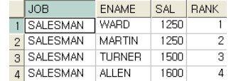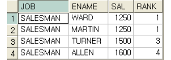 SELECT job, ename, sal, RANK() OVER (PARTITION BY deptno ORDER BY sal DESC ) as rank