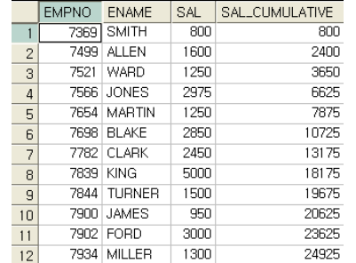,(sum(sal)OVER(ORDER BY empno)) AS SAL_CUMULATIVE