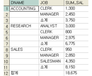 from( select dname, case grouping(job) when 1 then '소계' else job end as job ,sum(sal) sum_sal,
