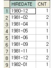 2. 사원 테이블에서 고용일자(HIREDATE)를 년월 별로 사원수를 아래 예제처럼 출력하세요?